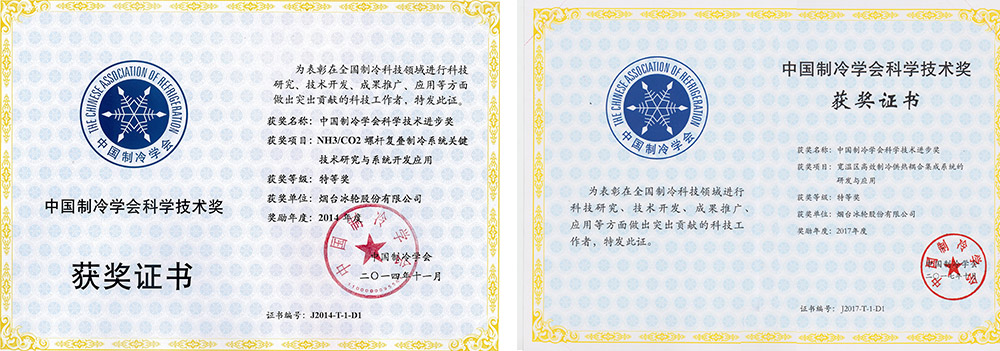 “NH3/CO2螺桿復疊制冷系統關鍵技術研究與系統開發應用”獲山東省科技進步一等獎和中國制冷學會科技進步特等獎。