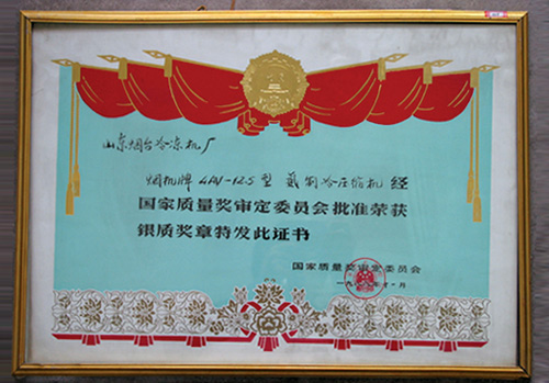1988年11月,煙機牌4AV-12.5型氨制冷壓縮機獲國家質量銀質獎章。