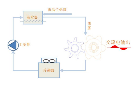 基于有機郎肯循環(Organic Rankine Cycle簡稱ORC)原理,利用低品位熱源產生動力:通過低沸點有機工質獲取其他介質的熱能,轉化為壓力能,通過膨脹機將壓力能轉化為機械能,最終通過發電機將機械能轉化為電能。